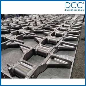 熱處理后達到很高的抗拉強度和耐磨性,套筒,銷軸采用表面高頻的工藝,提高了表面的硬度,使鏈條具有超高的耐磨性。鏈條的鏈板和刮板兩側采用高耐磨焊絲堆焊的工藝,用國內先進的高耐磨焊絲,通過焊接機器人自動焊接,使得焊縫均勻的堆焊在鏈板兩側,同時,在鏈條其它容易磨損的地方也都采用了耐磨焊絲堆焊的工藝,使整個鏈條都具備超高的耐磨性,耐磨焊絲焊接后表面硬度可以達到HRC50-60,能長時間使用鏈條不磨損。