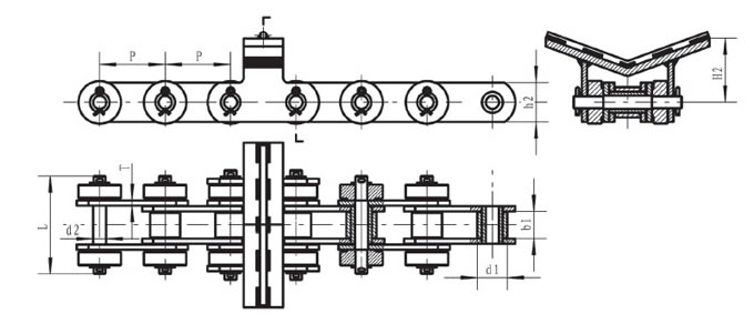 Pitch P (mm)Inner width of inner link b1 (mm)Diameter of roller d1 (mm)Diameter of pin d2 (mm)Length of pin (mm)Height of sidebar h2 (mm)Thickness of sidebar T (mm)Height of top chain H2 (mm)Tensile strength Q (KN)