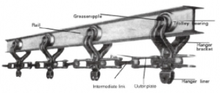 滑架的作用是承受物件,吊具及鏈條的重量,仔垂直彎曲段還要承受鏈條張緊的合力,并能保證鏈條按軸道的線路運行。在線路中兩個負載滑架之間距離超過800-900mm時,可在中間增加一個空載滑架。滑架系列主要包括X348型, X458型, X678型, CC100型, X160型 。