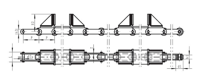 Pitch P (mm)Inner width of inner link b1 (mm)Diameter of roller d1 (mm)Diameter of pin d2 (mm)Length of pin L (mm)Height of sidebar h2 (mm)Thickness of sidebar T (mm)Width of attached plate H2 (mm)Tensile strength Q (KN)